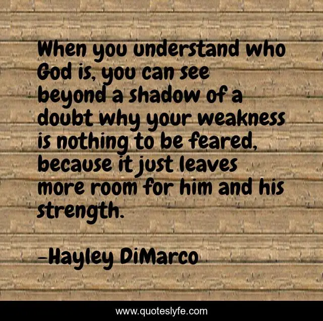 This page presents the quote "When you understand who God is, you can see beyond a shadow of a doubt why your weakness is nothing to be feared, because it just leaves more room for him and his strength.". Author of this quote is Hayley DiMarco. This quote is about faith, strength, weakness, doubt, god, shadow, trust, die-young,.