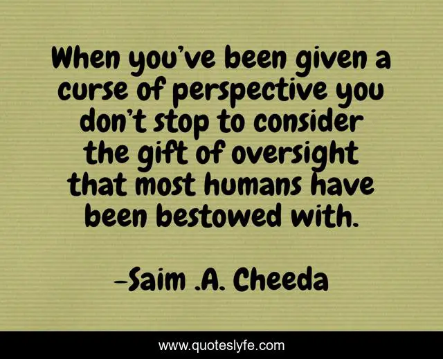 This page presents the quote "When you’ve been given a curse of perspective you don’t stop to consider the gift of oversight that most humans have been bestowed with.". Author of this quote is Saim .A. Cheeda. This quote is about curse, interpretation, consider, gift, abstract, reality, thought, bestow, perspective,.