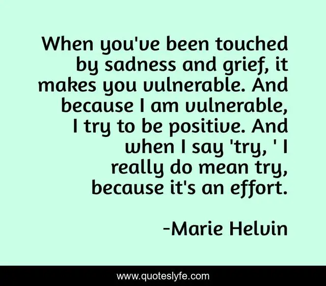 This page presents the quote "When you've been touched by sadness and grief, it makes you vulnerable. And because I am vulnerable, I try to be positive. And when I say 'try, ' I really do mean try, because it's an effort.". Author of this quote is Marie Helvin. This quote is about grief, sadness,.