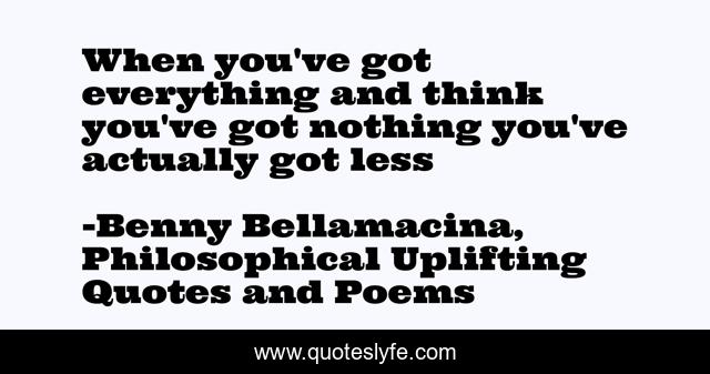 This page presents the quote "When you've got everything and think you've got nothing you've actually got less". Author of this quote is Benny Bellamacina, Philosophical Uplifting Quotes and Poems. This quote is about quote, life, philosophy, quotes, wisdom,.