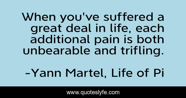 This page presents the quote "When you've suffered a great deal in life, each additional pain is both unbearable and trifling.". Author of this quote is Yann Martel, Life of Pi. This quote is about sadness, suffering,.