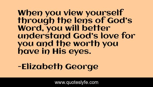 This page presents the quote "When you view yourself through the lens of God’s Word, you will better understand God’s love for you and the worth you have in His eyes.". Author of this quote is Elizabeth George. This quote is about faith, eyes, christian, love, god, lens, him, yourself, bless,.