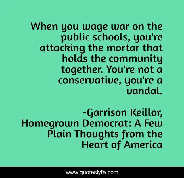This page presents the quote "When you wage war on the public schools, you're attacking the mortar that holds the community together. You're not a conservative, you're a vandal.". Author of this quote is Garrison Keillor, Homegrown Democrat: A Few Plain Thoughts from the Heart of America. .