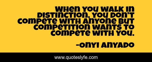 This page presents the quote "When you walk in distinction, you don’t compete with anyone but competition wants to compete with you.". Author of this quote is Onyi Anyado. This quote is about distinctive-footprints-of-life, donald-trump, business, quotes-to-make-you-think, competition, entrepreneurship, distinctiveness, entrepreneur, richard-branson,.