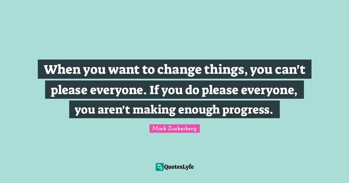 This page presents the quote "When you want to change things, you can't please everyone. If you do please everyone, you aren't making enough progress.". Author of this quote is Mark Zuckerberg. This quote is about enough, change, please, progress,.