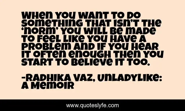 This page presents the quote "When you want to do something that isn’t the ‘norm’ you will be made to feel like you have a problem and if you hear it often enough then you start to believe it too.". Author of this quote is Radhika Vaz, Unladylike: A Memoir. This quote is about being-different, choices,.