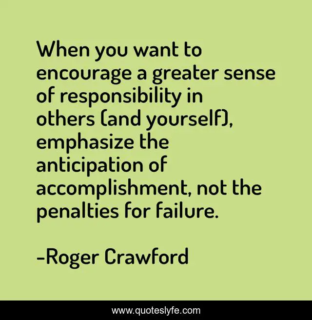 This page presents the quote "When you want to encourage a greater sense of responsibility in others (and yourself), emphasize the anticipation of accomplishment, not the penalties for failure.". Author of this quote is Roger Crawford. This quote is about accomplishments, responsibility, encouragement,.
