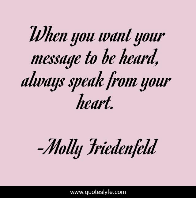 This page presents the quote "When you want your message to be heard, always speak from your heart.". Author of this quote is Molly Friedenfeld. This quote is about enthusiasm, kindness, speak-from-your-heart, inspirational, unconditional-love,.
