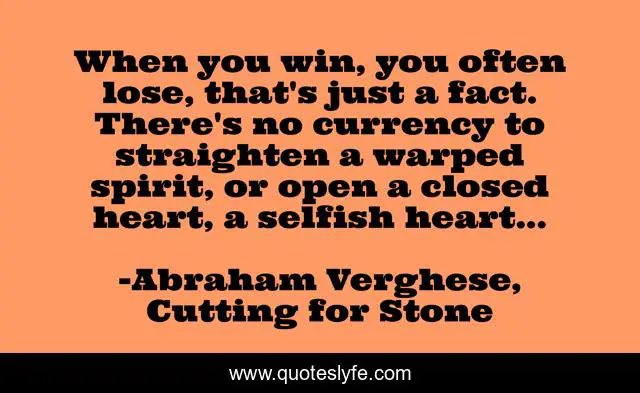 This page presents the quote "When you win, you often lose, that's just a fact. There's no currency to straighten a warped spirit, or open a closed heart, a selfish heart...". Author of this quote is Abraham Verghese, Cutting for Stone. .