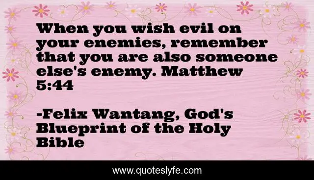 This page presents the quote "When you wish evil on your enemies, remember that you are also someone else's enemy. Matthew 5:44". Author of this quote is Felix Wantang, God's Blueprint of the Holy Bible. This quote is about jesus-christ, enemy, someone, remember, god, holy-bible, wish, holy-spirit,.