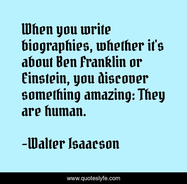 This page presents the quote "When you write biographies, whether it's about Ben Franklin or Einstein, you discover something amazing: They are human.". Author of this quote is Walter Isaacson. This quote is about discover, human,.