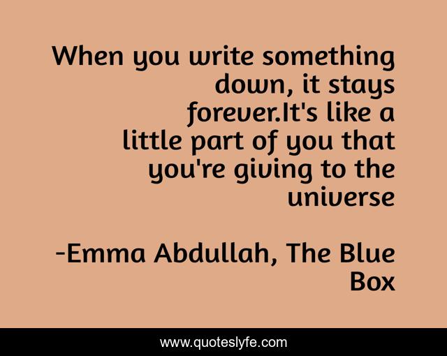 This page presents the quote "When you write something down, it stays forever.It's like a little part of you that you're giving to the universe". Author of this quote is Emma Abdullah, The Blue Box. This quote is about universe, letter, writing,.