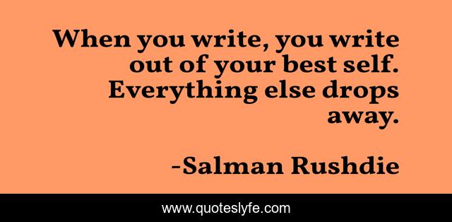 This page presents the quote "When you write, you write out of your best self. Everything else drops away.". Author of this quote is Salman Rushdie. This quote is about books, author, novels, writing,.