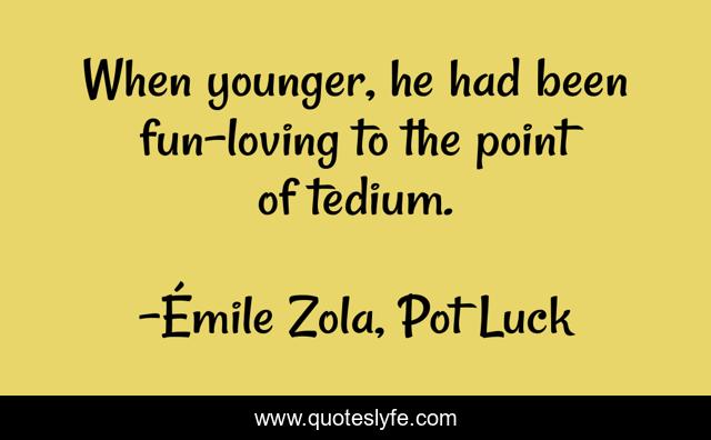 This page presents the quote "When younger, he had been fun-loving to the point of tedium.". Author of this quote is Émile Zola, Pot Luck. This quote is about fun, tedium, youth, getting-old,.