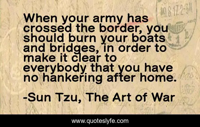 This page presents the quote "When your army has crossed the border, you should burn your boats and bridges, in order to make it clear to everybody that you have no hankering after home.". Author of this quote is Sun Tzu, The Art of War. This quote is about war, business, strategy,.