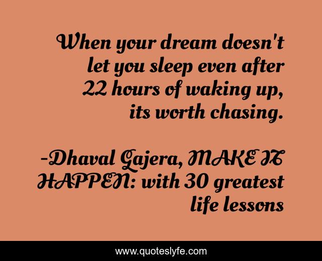 This page presents the quote "When your dream doesn't let you sleep even after 22 hours of waking up, its worth chasing.". Author of this quote is Dhaval Gajera, MAKE IT HAPPEN: with 30 greatest life lessons. .