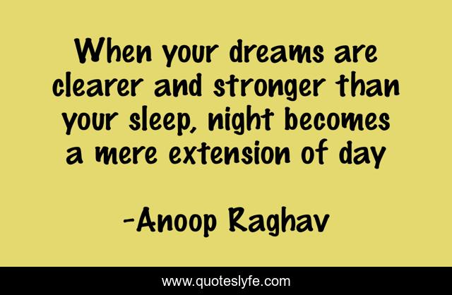 This page presents the quote "When your dreams are clearer and stronger than your sleep, night becomes a mere extension of day". Author of this quote is Anoop Raghav. This quote is about life, dream, day, night,.