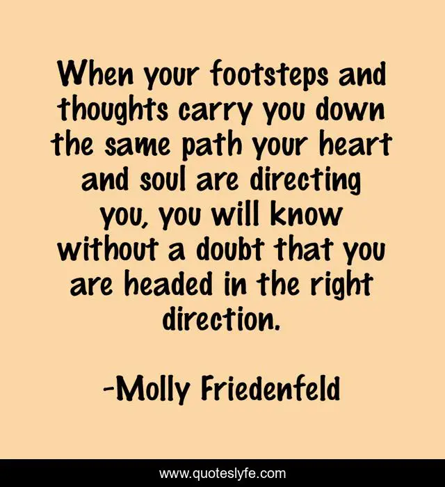 This page presents the quote "When your footsteps and thoughts carry you down the same path your heart and soul are directing you, you will know without a doubt that you are headed in the right direction.". Author of this quote is Molly Friedenfeld. This quote is about heart, life-purpose, molly-friedenfeld, inspirational, enthusiasm, path, footsteps,.