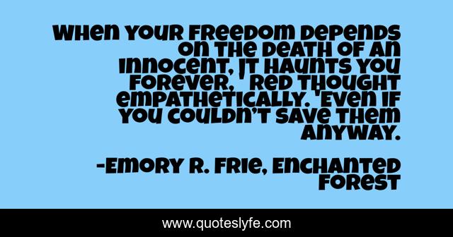 This page presents the quote "When your freedom depends on the death of an innocent, it haunts you forever, ' Red thought empathetically. 'Even if you couldn’t save them anyway.". Author of this quote is Emory R. Frie, Enchanted Forest. This quote is about freedom, sacrifice, red-riding-hood, cost-of-freedom, haunt,.