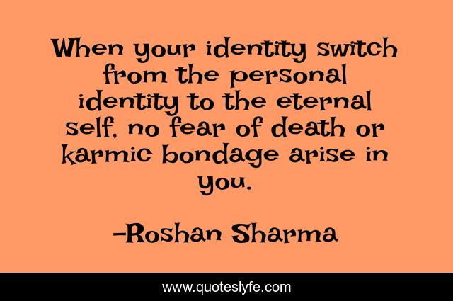 This page presents the quote "When your identity switch from the personal identity to the eternal self, no fear of death or karmic bondage arise in you.". Author of this quote is Roshan Sharma. This quote is about religion, salvation, perfection, divine-life,.