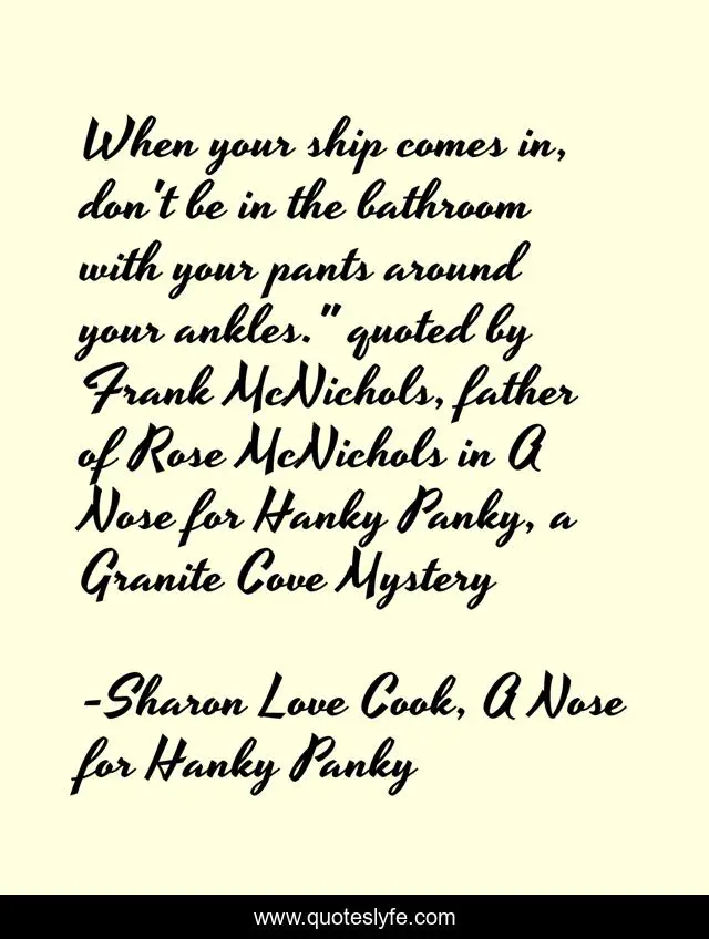 This page presents the quote "When your ship comes in, don't be in the bathroom with your pants around your ankles." quoted by Frank McNichols, father of Rose McNichols in A Nose for Hanky Panky, a Granite Cove Mystery". Author of this quote is Sharon Love Cook, A Nose for Hanky Panky. This quote is about humor-and-suspense, mystery, women-sleuths, new-england-fishing-village,.