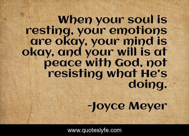 This page presents the quote "When your soul is resting, your emotions are okay, your mind is okay, and your will is at peace with God, not resisting what He's doing.". Author of this quote is Joyce Meyer. This quote is about god, mind, soul,.