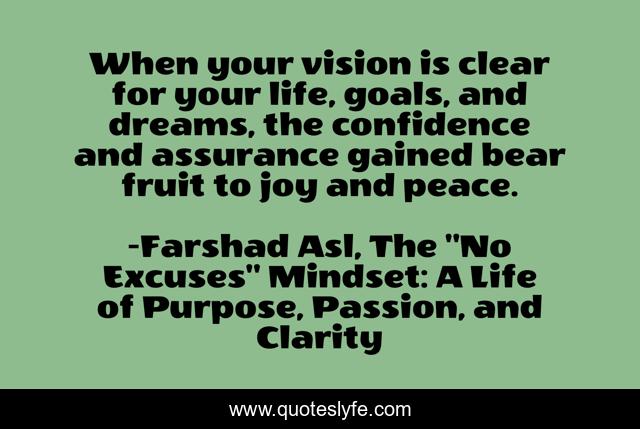 This page presents the quote "When your vision is clear for your life, goals, and dreams, the confidence and assurance gained bear fruit to joy and peace.". Author of this quote is Farshad Asl, The "No Excuses" Mindset: A Life of Purpose, Passion, and Clarity. This quote is about life, joy, peace, goals, clarity, dreams, vision,.