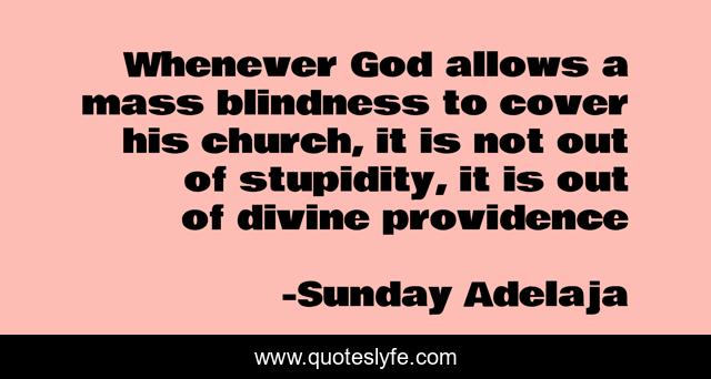 This page presents the quote "Whenever God allows a mass blindness to cover his church, it is not out of stupidity, it is out of divine providence". Author of this quote is Sunday Adelaja. This quote is about god, whenever, cover, allows, stupidity, mass, church, blindness, divine,.