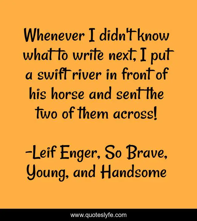 This page presents the quote "Whenever I didn't know what to write next, I put a swift river in front of his horse and sent the two of them across!". Author of this quote is Leif Enger, So Brave, Young, and Handsome. .