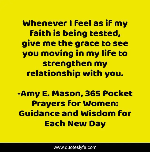 This page presents the quote "Whenever I feel as if my faith is being tested, give me the grace to see you moving in my life to strengthen my relationship with you.". Author of this quote is Amy E. Mason, 365 Pocket Prayers for Women: Guidance and Wisdom for Each New Day. This quote is about faith, relationship, god, christianity, trust, grace,.