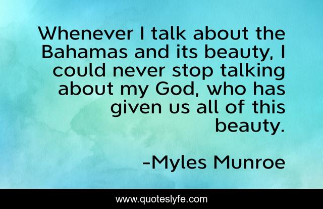 This page presents the quote "Whenever I talk about the Bahamas and its beauty, I could never stop talking about my God, who has given us all of this beauty.". Author of this quote is Myles Munroe. This quote is about god, stop, talk,.