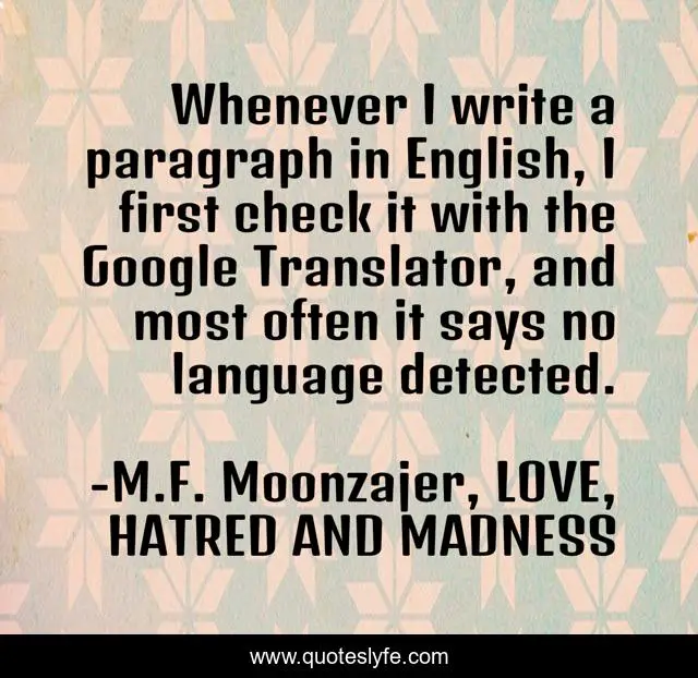 This page presents the quote "Whenever I write a paragraph in English, I first check it with the Google Translator, and most often it says no language detected.". Author of this quote is M.F. Moonzajer, LOVE, HATRED AND MADNESS. This quote is about grammar, language, google-translator, detected, paragraph, english,.