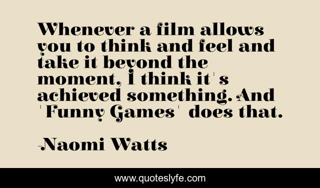 This page presents the quote "Whenever a film allows you to think and feel and take it beyond the moment, I think it's achieved something. And 'Funny Games' does that.". Author of this quote is Naomi Watts. This quote is about moment, think,.