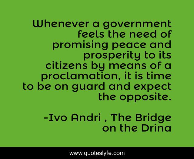This page presents the quote "Whenever a government feels the need of promising peace and prosperity to its citizens by means of a proclamation, it is time to be on guard and expect the opposite.". Author of this quote is Ivo Andrić, The Bridge on the Drina. This quote is about peace, government,.