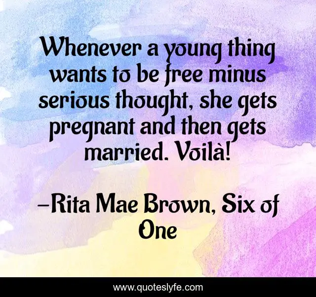 This page presents the quote "Whenever a young thing wants to be free minus serious thought, she gets pregnant and then gets married. Voilà!". Author of this quote is Rita Mae Brown, Six of One. This quote is about youth, women,.