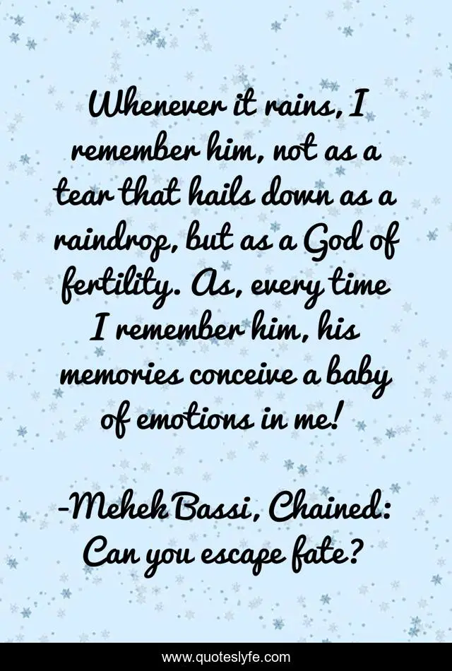 This page presents the quote "Whenever it rains, I remember him, not as a tear that hails down as a raindrop, but as a God of fertility. As, every time I remember him, his memories conceive a baby of emotions in me!". Author of this quote is Mehek Bassi, Chained: Can you escape fate?. This quote is about memories, life, lovers, love, love-story, breakup, philosophy, experience, hurt,.