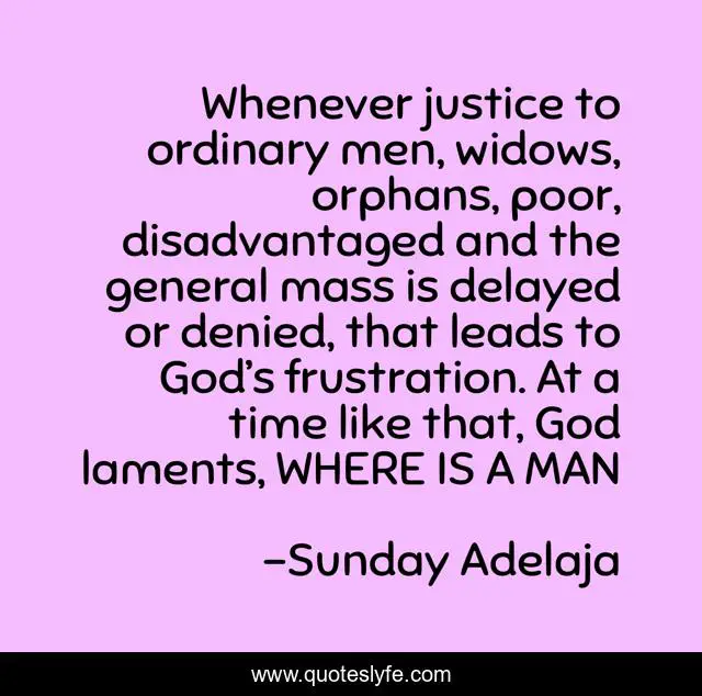 This page presents the quote "Whenever justice to ordinary men, widows, orphans, poor, disadvantaged and the general mass is delayed or denied, that leads to God’s frustration. At a time like that, God laments, WHERE IS A MAN". Author of this quote is Sunday Adelaja. This quote is about poor, disadvantaged, men, like, justice, god, orphans, denied, delayed,.
