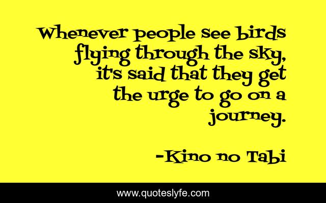 This page presents the quote "Whenever people see birds flying through the sky, it's said that they get the urge to go on a journey.". Author of this quote is Kino no Tabi. This quote is about kino-no-tabi, journey, anime, birds,.
