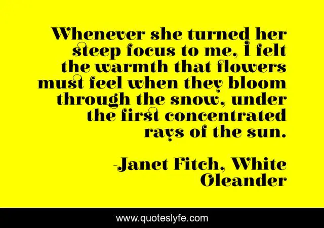 This page presents the quote "Whenever she turned her steep focus to me, I felt the warmth that flowers must feel when they bloom through the snow, under the first concentrated rays of the sun.". Author of this quote is Janet Fitch, White Oleander. This quote is about sun, attention, love, snow, affection,.