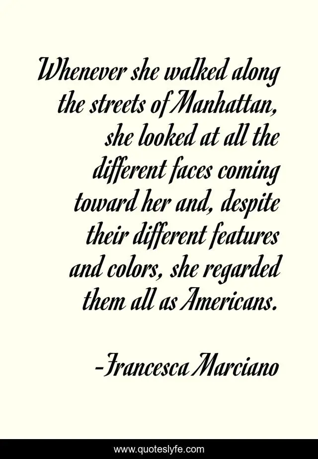 This page presents the quote "Whenever she walked along the streets of Manhattan, she looked at all the different faces coming toward her and, despite their different features and colors, she regarded them all as Americans.". Author of this quote is Francesca Marciano. This quote is about life-and-living, diversity,.