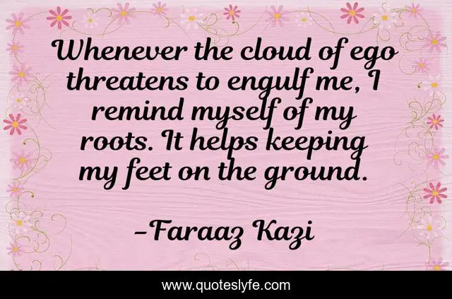 This page presents the quote "Whenever the cloud of ego threatens to engulf me, I remind myself of my roots. It helps keeping my feet on the ground.". Author of this quote is Faraaz Kazi. This quote is about motivation, grounded, celebrity, down-to-earth, behaviour, attitude, ego, inspirational, enthusiasm,.