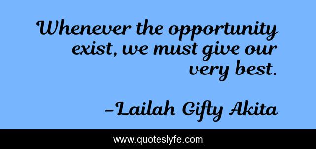 This page presents the quote "Whenever the opportunity exist, we must give our very best.". Author of this quote is Lailah Gifty Akita. This quote is about best-life, positive-attitude, lessons-learnt, inspirational, self-help, enthusiasm, opportunity, achievement,.
