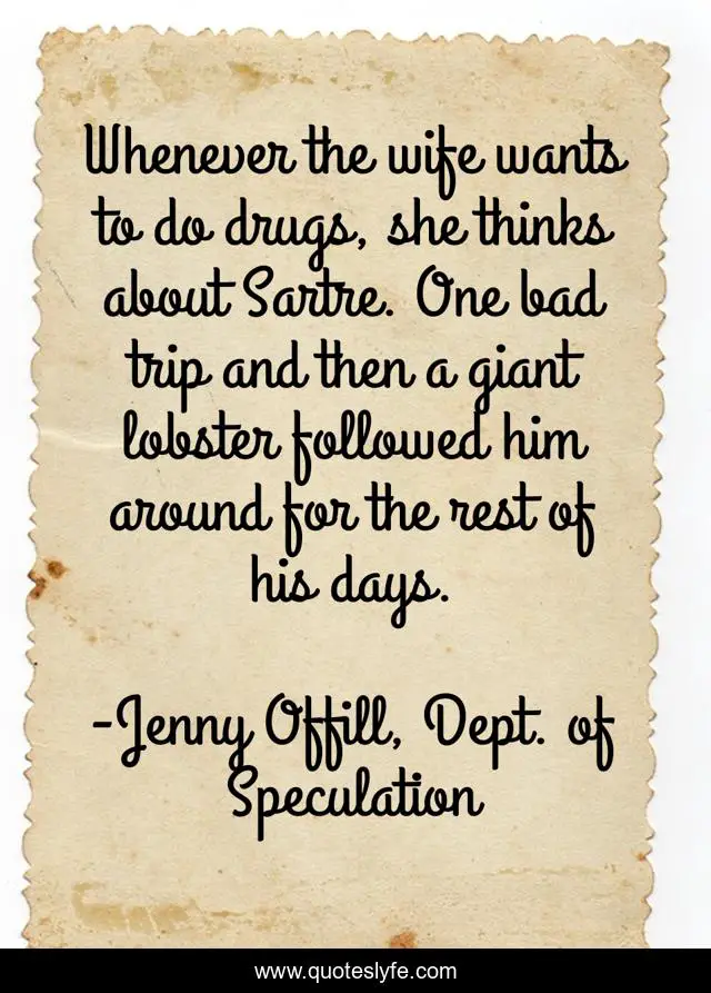 This page presents the quote "Whenever the wife wants to do drugs, she thinks about Sartre. One bad trip and then a giant lobster followed him around for the rest of his days.". Author of this quote is Jenny Offill, Dept. of Speculation. This quote is about drugs, sartre,.