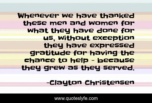 This page presents the quote "Whenever we have thanked these men and women for what they have done for us, without exception they have expressed gratitude for having the chance to help - because they grew as they served.". Author of this quote is Clayton Christensen. This quote is about gratitude, men, women,.