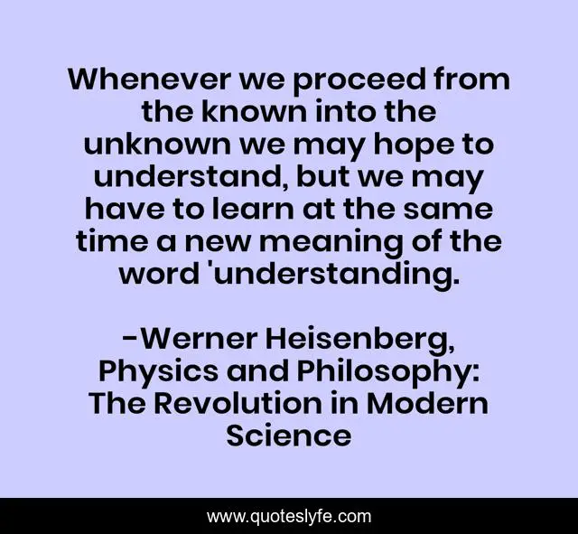 This page presents the quote "Whenever we proceed from the known into the unknown we may hope to understand, but we may have to learn at the same time a new meaning of the word 'understanding.". Author of this quote is Werner Heisenberg, Physics and Philosophy: The Revolution in Modern Science. This quote is about proceed, science, learn, understanding, meaning, understand, unknown, known,.