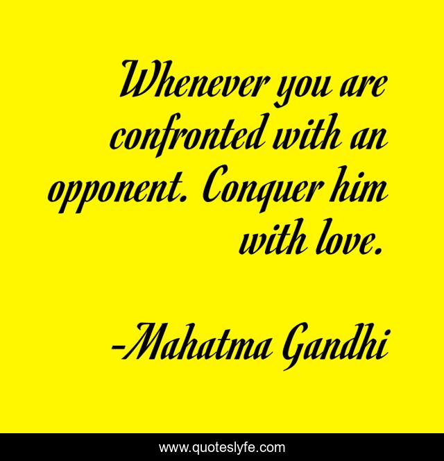 This page presents the quote "Whenever you are confronted with an opponent. Conquer him with love.". Author of this quote is Mahatma Gandhi. This quote is about love, peace, brotherly-love, trial, victory, fighting, affection, enemies,.
