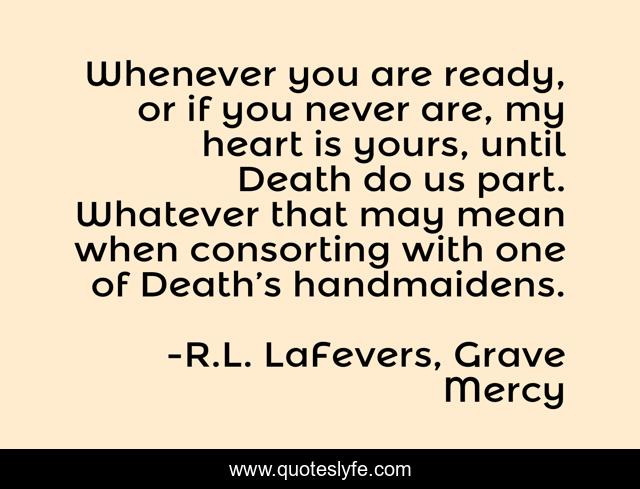 This page presents the quote "Whenever you are ready, or if you never are, my heart is yours, until Death do us part. Whatever that may mean when consorting with one of Death’s handmaidens.". Author of this quote is R.L. LaFevers, Grave Mercy. This quote is about love, affection,.