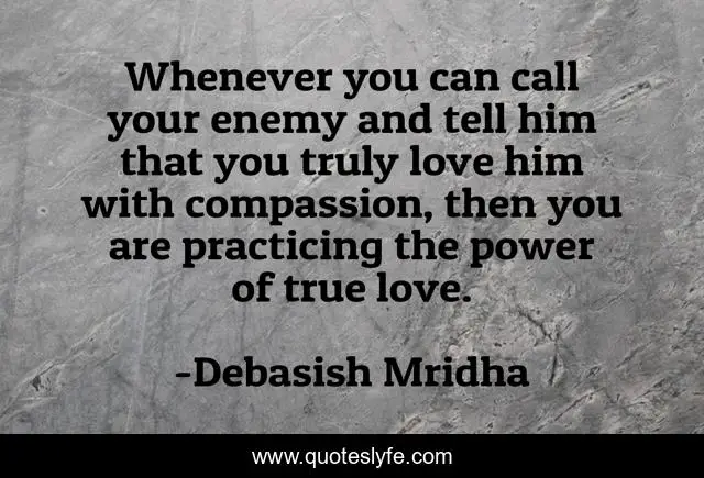 This page presents the quote "Whenever you can call your enemy and tell him that you truly love him with compassion, then you are practicing the power of true love.". Author of this quote is Debasish Mridha. This quote is about life, love, knowledge, inspirational, intelligence, philosophy, wisdom, quotes, affection,.