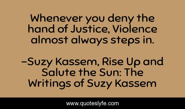 This page presents the quote "Whenever you deny the hand of Justice, Violence almost always steps in.". Author of this quote is Suzy Kassem, Rise Up and Salute the Sun: The Writings of Suzy Kassem. This quote is about truthfulness, right, raise-your-voice, justice, unjust, violence, unfair, injustice, truth,.