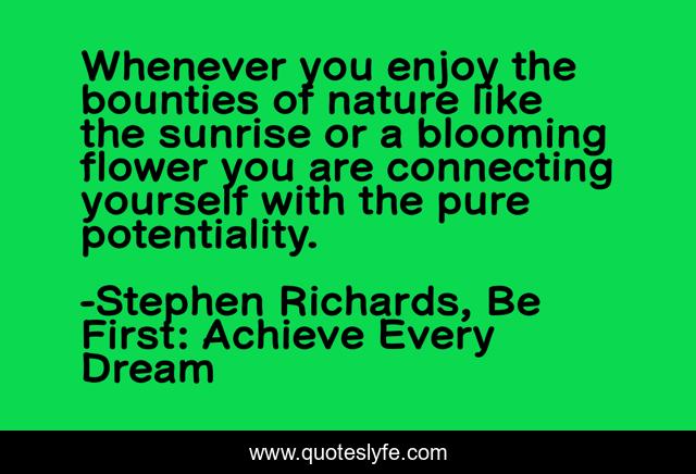 This page presents the quote "Whenever you enjoy the bounties of nature like the sunrise or a blooming flower you are connecting yourself with the pure potentiality.". Author of this quote is Stephen Richards, Be First: Achieve Every Dream. This quote is about stephen-richards, nature, self-help,.